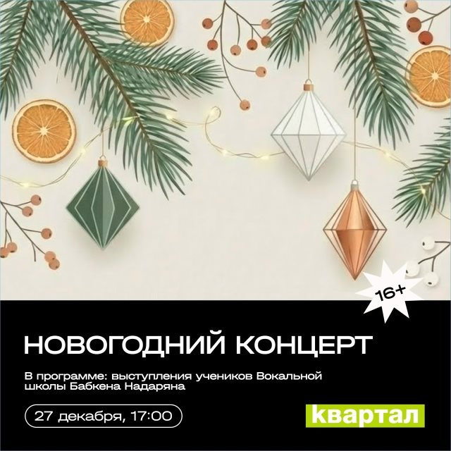 А 27 декабря здесь же состоится новогодний концерт от вокальной школы Бабкена Надаряна. Слушателей ждут живое исполнение, любимые хиты и море праздничного настроения. (16+)