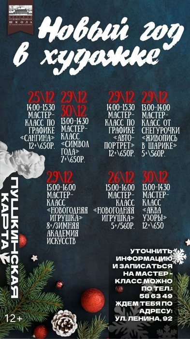На живописных мастер-классах в эти выходные создают зимние зарисовки (12+) и мандариновое настроение (16+) в салоне «Искусство 73», расписывают фигурку лошади – символа наступающего года - в котокафе «Теплый кот» (6+), новогодние шары в тематике «Цирк» и новогодние открытки - в творческой студии «Минаева Арт» (16+), матрешку - в творческом пространстве CORSTEN ART** (18+).