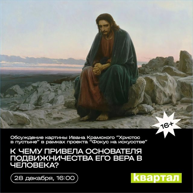 В креативном пространстве «Квартал» пройдёт обсуждение картины Ивана Крамского «Христос в пустыне» в рамках проекта «Фокус на искусстве». Иван Николаевич Крамской (1837—1887) — русский живописец и график, сторонник «демократического реализма», один из наиболее значимых петербургских художников пореформенной эпохи, художественный критик и педагог. «Христос в пустыне» считается этапным произведением Крамского и значительным явлением всей русской живописи. Художник рассматривает религиозный сюжет с гуманистической, морально-философской точки зрения и предлагает психологически-жизненную интерпретацию размышлений и переживаний Христа. Таким образом, картину можно рассматривать не только как живописное произведение, но и как созданный в красках философский трактат. Вход свободный. (16+)