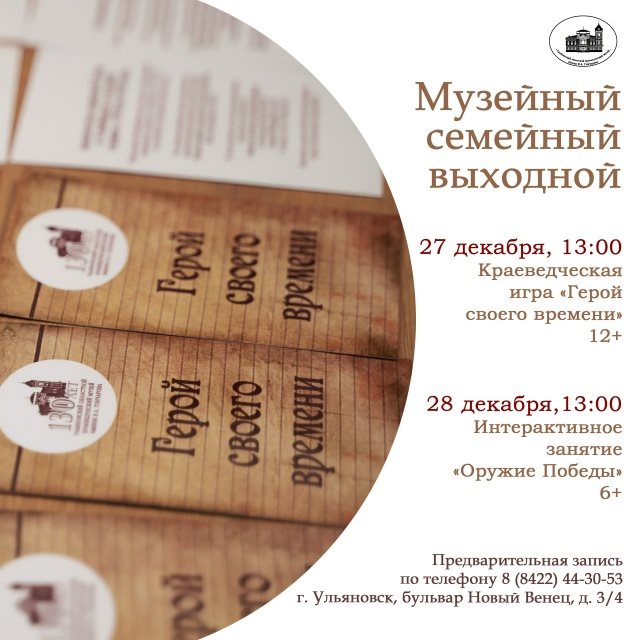 Ульяновский областной краеведческий музей имени И.А. Гончарова приглашает на музейный семейный выходной. Образовательная краеведческая игра «Герой своего времени» будет интересна детям среднего и старшего школьного возраста, студентам и даже взрослым. В ходе игры участники познакомятся со знаменитыми земляками и жителями Симбирской губернии и Ульяновской области. Игра помогает лучше узнать историю и культуру родного края. (12+)