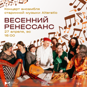 Любители музыки насладятся музыкальным искусством эпохи Возрождения в стенах Ульяновского областного художественного музея. Лучшие образцы итальянской, французской и английской музыки XV–XVI прозвучат в исполнении ансамбля Alteratio** – уникального коллектива музыкантов, играющих на аутентичных музыкальных инструментах. Руководитель ансамбля - Олег Киселев, вокальные партии исполнит Любовь Скворцова. (12+).