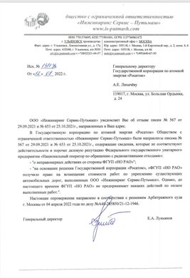 В результате ООО «Инжиниринг Сервис-Путьмаш» выполнил решение суда и отозвал ранее направленные в Государственную корпорацию по атомной энергии «Росатом» письма, признав содержащие в них сведения не соответствующими действительности и порочащими деловую репутацию ФГУП «НО РАО».