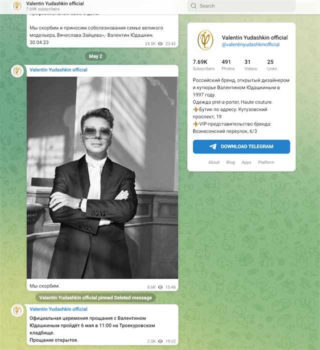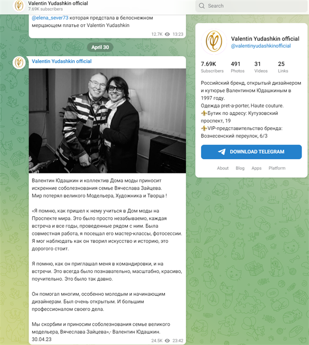 Валентин Юдашкин боролся с онкологией с 2016 года и старался работать до последнего, пока позволяли силы. Весной этого года он планировал лично представить на показе мод в Санкт-Петербурге новую весенне-летнюю коллекцию. По случаю ухода коллеги Вячеслава Зайцева Юдашкин опубликовал в своем Телеграм-канале трогательный пост-соболезнование.