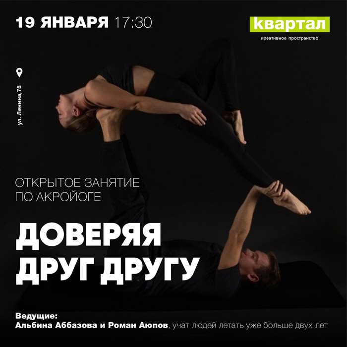 Для тех, кто всегда на спорте, состоится открытое занятие по акройоге «Доверяя друг другу». Занятие построят таким образом, чтобы каждый смог поймать ощущение полёта и удивиться возможностям своего тела. Иметь в спортивном прошлом «шпагат» и «мостик» необязательно. 16+.