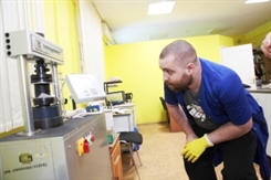 После спрессованный асфальтовый цилиндр извлекают из «снаряда». Как и все здесь, с помощью специального аппарата, своего рода пресса наоборот, который выдавливает «кусок дороги» наружу. С этим кусочком и будут в дальнейшем колдовать в лаборатории.