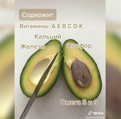 Тёмно-зелёные плоды с негладкой шкуркой и косточкой внутри содержат клетчатку, калий, витамины группы В, К, Е и С, а также фолиевую кислоту, которая снижает риск врождённых аномалий у будущего ребёнка, если девушка находится в положении.