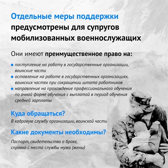 В кратчайшие сроки были разработаны меры соцподдержки, которые закрывают все те проблемы, трудности, которые могут коснуться семей мобилизованных. Речь идет об адресной поддержке. Это материальная, юридическая, психологическая помощь, устройство детей в детские сады и школы, а также при необходимости содействие в устройстве на работу, переобучение и получение новой квалификации жен призванных по мобилизации.
