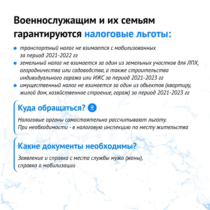 Напомним: меры поддержки включают в себя в том числе работу по упрощению и ускорению бюрократических процедур. Помимо этого, военнослужащим и их семьям гарантируются налоговые льготы - с них не будет взиматься транспортный налог за 2021 - 2022 годы, земельный налог за 2021 - 2023 годы и имущественный налог за один из объектов за 2021 - 2023 годы.