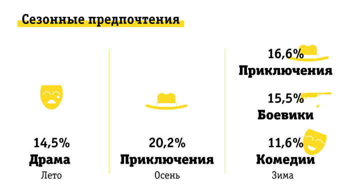 Также интересно, как меняются настроения россиян со сменой сезона: если летом самым популярным жанром у абонентов была драма (14,5%), то осенью на первое место выходят приключенческие фильмы (20,2%). В зимние же месяцы жители чаще выбирают боевики (15,5%), приключения (16,6%) и комедии (11,6%).