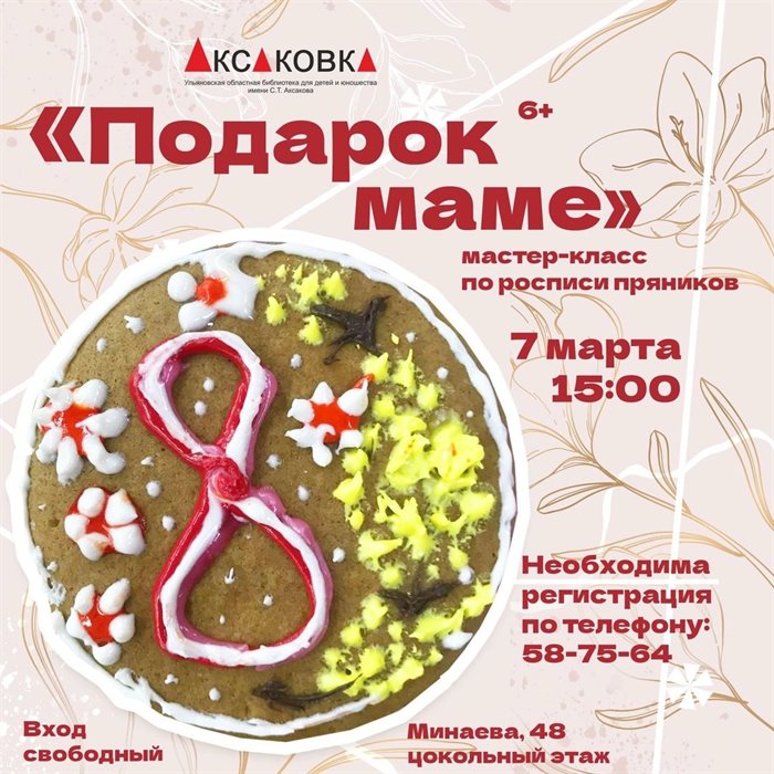 Мастер-классы предстоящих выходных посвящены исключительно созданию подарков для прекрасной половины человечества. 7 марта в 15:00 Ульяновская областная библиотека имени Аксакова приглашает на мастер-класс по росписи пряников. Вход свободный, по предварительной регистрации. 6+.