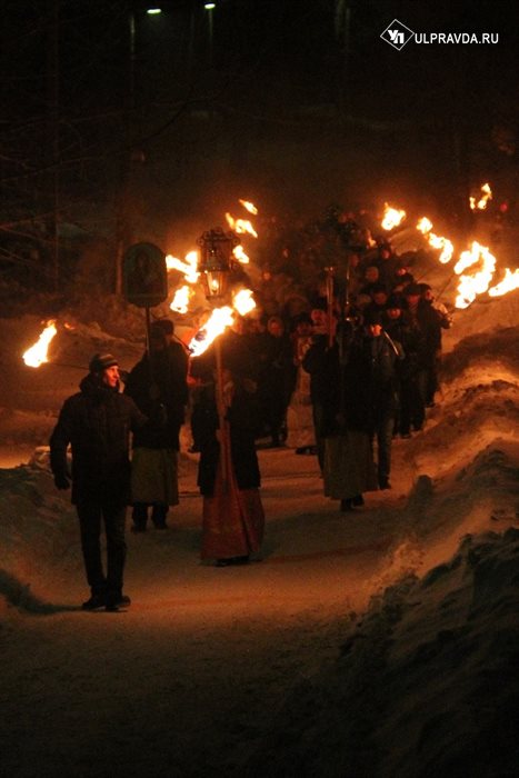 В Ульяновске мест для купания определили девять. Но традиционно наиболее популярными считаются купели возле автомеханического техникума. А если быть точнее – около Духосошественского храма. Популярность их можно объяснить, во-первых, доступностью, а во-вторых, необычным действом, которое каждый год происходит здесь в крещенскую ночь. Купания у Духосошественского храма предвещает крестный ход, освещенный светом десятков факелов. Шествию это придает особенную торжественность. Не отказались от традиции и в этом году. И если в 2018 крестный ход с факелами просто обошел храм, то в этом направился к купелям, где настоятель церкви отец Владимир провел освещение воды.
