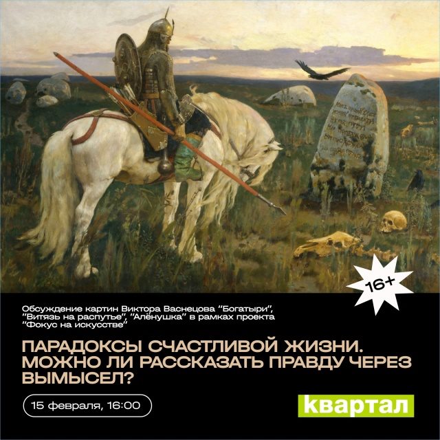 В креативном пространстве «Квартал» создают свои традиции: в выходные здесь говорят о серьезном. В воскресенье в рамках проекта «Фокус на искусстве» здесь будут обсуждать картины Виктора Васнецова "Богатыри", "Витязь на распутье", "Алёнушка".  А вечером – главный фильм XX века – бессмертный «Броненосец “Потёмкин”» Сергея Эйзенштейна. Повторный выход фильма на экраны приурочен к 100-летнему юбилею картины, что создает превосходные условия для погружения в отечественную историю кино. Почему фильм вошёл в учебники всех киновузов? В чем заключается специфика эстетики Эйзенштейна? И что позволяет «Потёмкину» оставаться на плаву зрительского интереса даже спустя 100 лет после премьеры? На эти и многие другие вопросы попытается ответить Никита Гриньков, кинокритик, автор «Искусство кино» и «Синема Рутин», а также куратор курса «Кинокритик» на платформе «Правое полушарие интроверта». (16+)