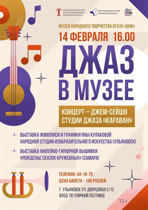Вечер джаза начнется в Музее народного творчества 14 февраля в 16:00. Гости погрузятся в мир мелодий, гармоний и ритмов, которые будут созданы музыкантами студии джаза «Караван» Дворца «Губернаторский». Также их ждут знакомство с выставкой живописи и графики ульяновского художника Яны Кулаковой и экскурсия по выставке филейно-гипюрной вышивки «Рождение сказок кружевных». (12+)