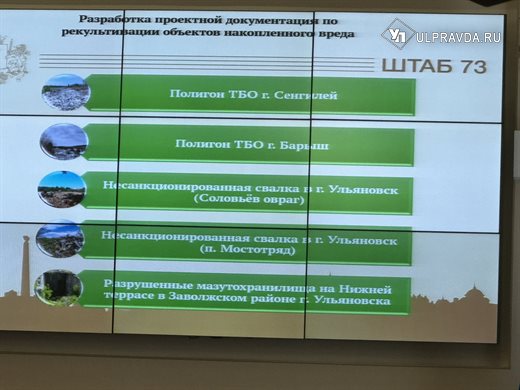 Кроме того, сейчас ведется разработка проектной документации по рекультивации полигонов ТБО в Сенгилее, в Барыше, несанкционированной свалки в Соловьевом овраге, в поселке Мостоотряд.