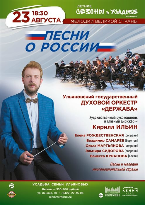 В усадьбе семьи Ульяновых зазвучит джаз в исполнении джаз-ансамбля «Академик бэнд», песни и мелодии многонациональной страны (играет Ульяновский государственный оркестр «Держава», главный дирижёр и художественный руководитель Кирилл Ильин), музыка русских и советских композиторов XIX-XX веков (на сцене Ульяновский государственный академический симфонический оркестр «Губернаторский», главный дирижёр Эдуард Дядюра) (6+).