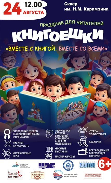 Ульяновские библиотеки приглашают читателей 24 августа в 12:00 в сквер им. Карамзина — здесь пройдет ежегодный праздник «Книгоешки. Вместе с книгой. Вместе со всеми». На площадке сквера юных читателей ждут встречи с детскими писателями, книжные выставки, программа с фокусником, мастер-классы, аквагрим, «кошачья» дискотека, а главное — новые друзья. (0+).