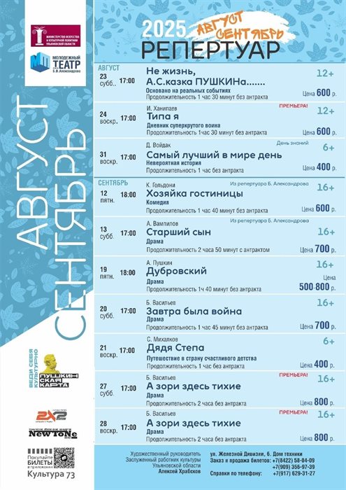 24 августа Ульяновский молодежный театр представит премьеру спектакля «Типа я» (12+) по пронзительной повести Ислама Ханипаева. Это не просто спектакль, это настоящее путешествие в детство, где смех и слезы идут рука об руку, а самые простые вещи обретают глубокий смысл. Театральную афишу на август-сентябрь смотрите ниже.
