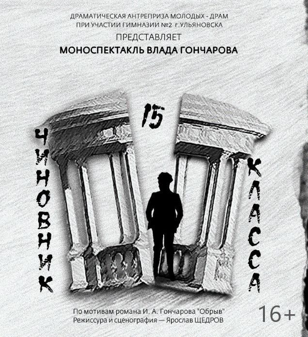 Ульяновские театры возвращаются с летних каникул. 23 августа ДРаматическая Антреприза Молодых (ДРАМ) и Гимназия № 2 представят премьеру моноспектакля Влада Гончарова «Чиновник 15 класса» (по мотивам романа И. А. Гончарова «Обрыв», 16+). В новом спектакле исследуются чувства «нового человека» Марка Волохова, его мятущаяся душа, полная лирических переживаний, его нравственное биполярное расстройство, которое и приводит молодого, умного и честного человека к краю обрыва. Постановка и сценография Ярослава Щедрова.