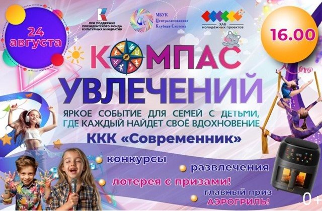 24 августа в 16.00 на площади перед ККК «Современник» начнется фестиваль детских объединений «Компас увлечений». В течение нескольких часов фестиваля зрителей ждут концерт с выступлениями талантливых детей со всего города, игровая программа, мастер-классы. И дети сразу же смогут записаться в кружки и секции в соответствии со своими интересами. (6+).