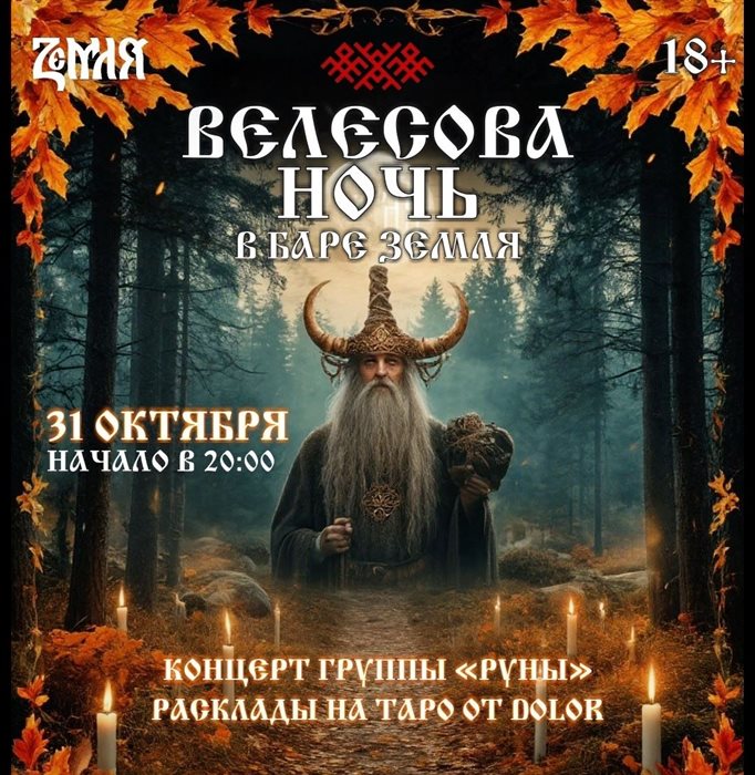 Кому Хэллоуин, а нам – Велесова ночь. В баре «Земля» сегодня будет звучать фолк-рок группа «Руны», а таролог раскроет тайные знаки и поведает, куда повернёт Колесо года. (18+)