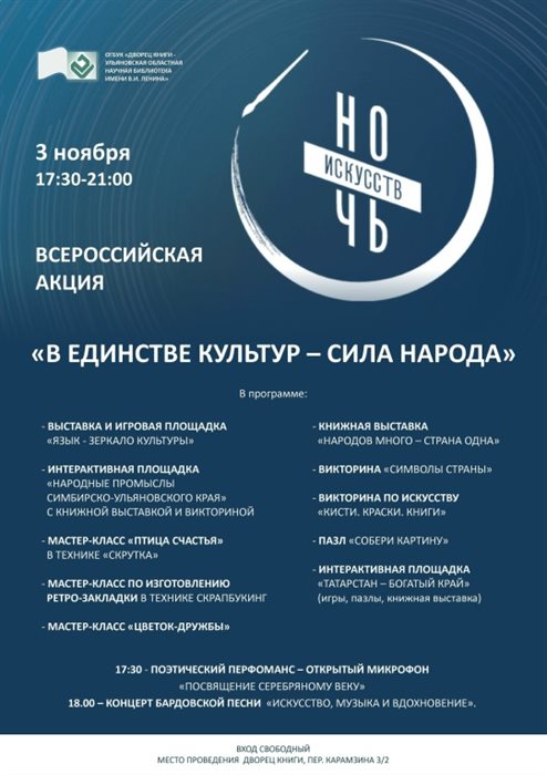 Большое количество мастер-классов и других мероприятий ждет ульяновцев 3 ноября с 17:30 до 21:00 во Дворце книги. Расписание на афише, вход свободный, 6+.