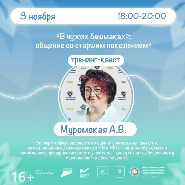 3 ноября в Доме молодых состоится тренинг-квест «В чужих башмаках». Это шанс разобраться в причинах межпоколенческих недопониманий и научиться находить общий язык. Спикер — Анна Муромская, эксперт по социальным проектам и психолог-консультант по безопасному взрослению в любом возрасте – поможет разрешить вечную проблему «отцов и детей». (16+)