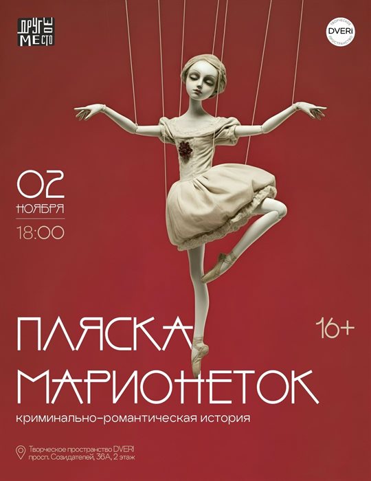 Театральная студия «Другое место» представит новый спектакль на площадке Dveri* в новом городе. Это сборник из трех новелл, раскрывающих тему любви и преданности. Это камерный спектакль, который повествует о нормальных или ненормальных отношениях в наше время. Его героев нельзя заранее любить или ненавидеть. Их даже осуждать нельзя, потому что каждый из них просто живет свою жизнь и хочет быть счастливым. Но способы, которыми они этого счастья добиваются, могут быть самыми неожиданными и спорными. (16+)