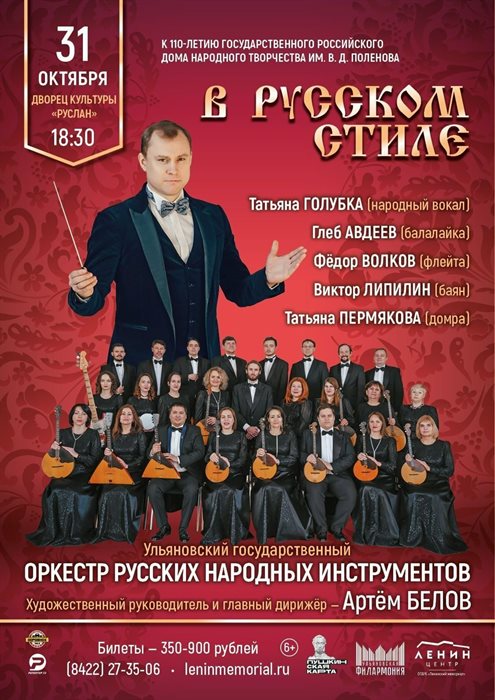 С программой «В русском стиле» с яркими образцами музыки для русского оркестра выступит в Новом городе Ульяновский государственный оркестр русских народных инструментов под управлением художественного руководителя и главного дирижёра Артёма Белова. На концерте своё мастерство продемонстрируют также солисты оркестра Татьяна Пермякова (домра), Виктор Липилин (баян), Глеб Авдеев (балалайка), Фёдор Волков (флейта) и солистка филармонии Татьяна Голубка (народный вокал). Программу представляет Элла Якубенкова. (6+)
