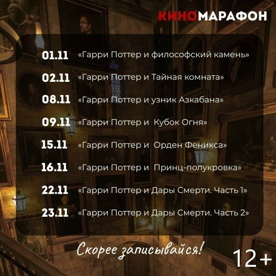 А в котокафе «Теплый кот» 1 ноября стартуют киновечера – все серии эпопеи о Гарри Поттере. Расписание на афише, 12+.
