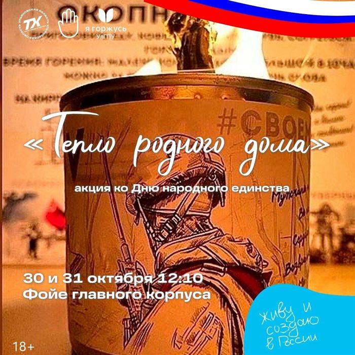 31 октября в УлГПУ им. И.Н. Ульянова проходит особая акция ко Дню народного единства — «Тепло твоего дома». На большой перемене студенты будут делать окопные свечи, чтобы отправить на передовую кусочек заботы из Ульяновска. (18+)