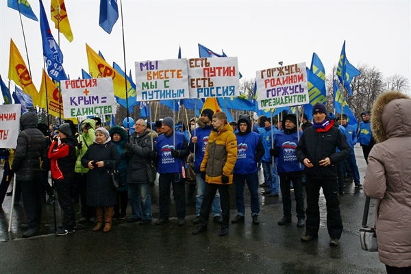 Участники акции пришли с плакатами: «Крым наш навсегда», «Вместе мы сила», «Я люблю Крым», «Спасибо Путину за Крым и Севастополь», «Россия+Крым=единство», «18 марта – День национальной гордости» и другие.