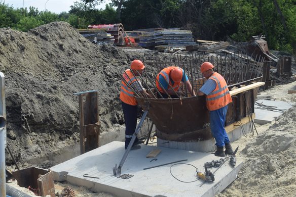 Как пояснил начальник производственно-технического отдела компании-подрядчика «Хотьковский автомост» Геннадий Калмыков, на опоре № 2 ведётся демонтаж шпунтового ограждения, на готовом ростверке ведётся армирование и установка опалубки для дальнейшего уширения стоек.