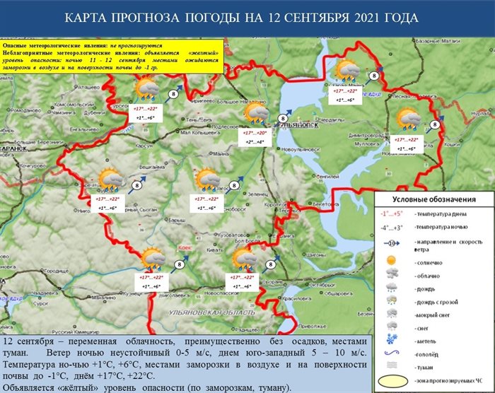 12 сентября в Ульяновской области ожидается переменная облачность, преимущественно без осадков, местами туман. Ветер днем юго-западный: 5 – 10 метров в секунду. Температура днём прогреется до +17°С, +22°С.