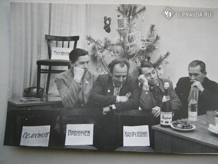 В ожидании Нового года: Антончик, Егоров, Тельнов, Архангельский. Табличками обозначены имена отсутствующих коллег.