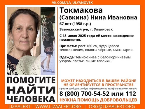 Нина Токмакова (Савкина) ушла из дома в темно-синем с бело-коричневыми узорами платье и синих тапочках. Сама женщина ростом 160 см, худощавого телосложения с черными волосами и карими глазами.