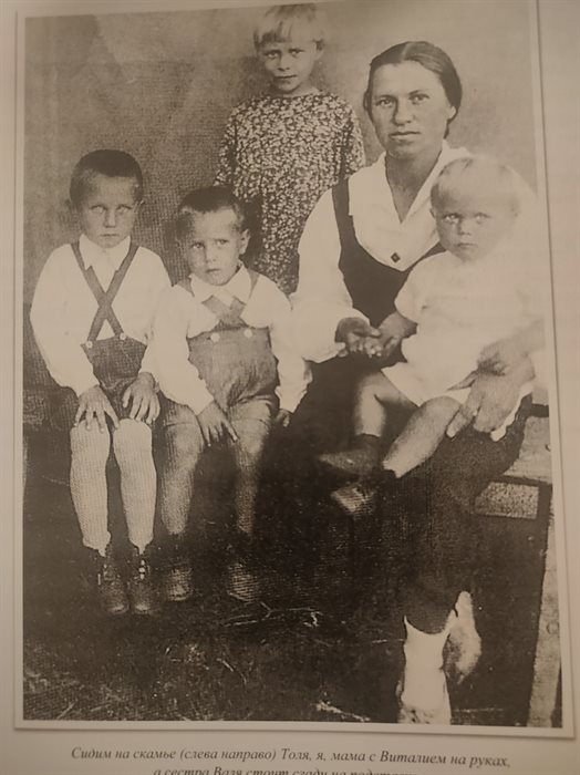 Неонила Андреевна Зотова с детьми: (слева направо) Толя, Борис, Виталик на руках у матери, Валя стоит. 1942