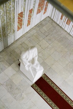 «А что это за окна на кровле?» - интересуюсь у Дубова. Оказывается, это естественная подсветка, называется зенитные фонари. Через них в Торжественный зал проникает солнечный и дневной свет. Лампочки отдыхают.