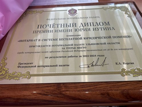 По результатам конкурса Нотариальной палате Ульяновской области присуждено третье место среди нотариальных палат РФ численностью от 56 до 100 нотариусов. Напомним: в предыдущие годы НПУО также удостаивалась почетной премии в номинациях «Нотариат и цифра», а также «Нотариат и общество».