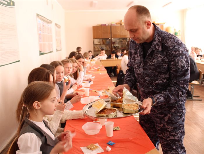 Затем подполковник Дмитрий Осипов и боец ОМОН «Симбир» рассказали детям о составе современного индивидуального рациона питания - сухпайка, рассчитанного на три полноценных приема пищи, в каждый из которых входят консервы, галеты, сладкое и напиток.