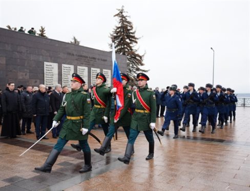 Цветы к Вечному огню возложили руководители правительства Ульяновской области, администрации города Ульяновска, депутатский корпус, ветераны, военнослужащие Ульяновского гарнизона, школьники и студенты.