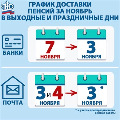 Отделения почтовой связи 3-го числа доставят пенсию за 3 и 4 ноября с учетом предпраздничного режима работы. Выплата пенсий за остальные дни пройдет по обычному графику с учетом режима работы отделений почтовой связи.