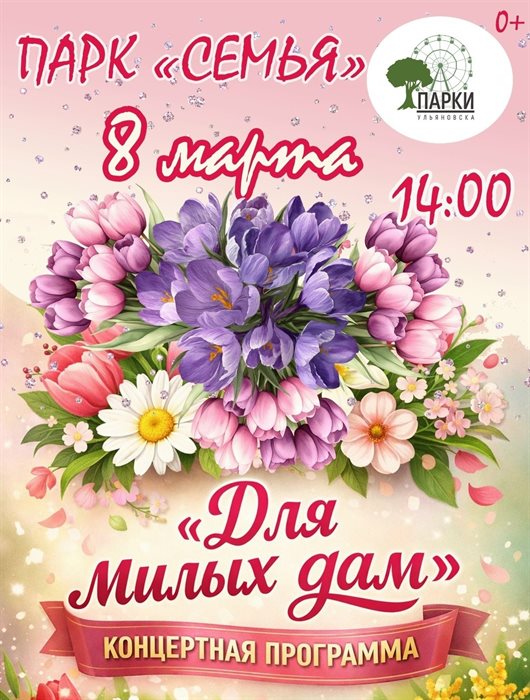 В самый нежный и красивый праздник весны парк «Семья» приглашает на яркую концертную программу, посвящённую Международному женскому дню. Будут звучать любимые песни, теплые поздравления. Хорошее настроение гарантировано. В других городских парках также запланировано проведение ярких праздничных программ для прекрасных жительниц Ульяновска и всех горожан. (0+)