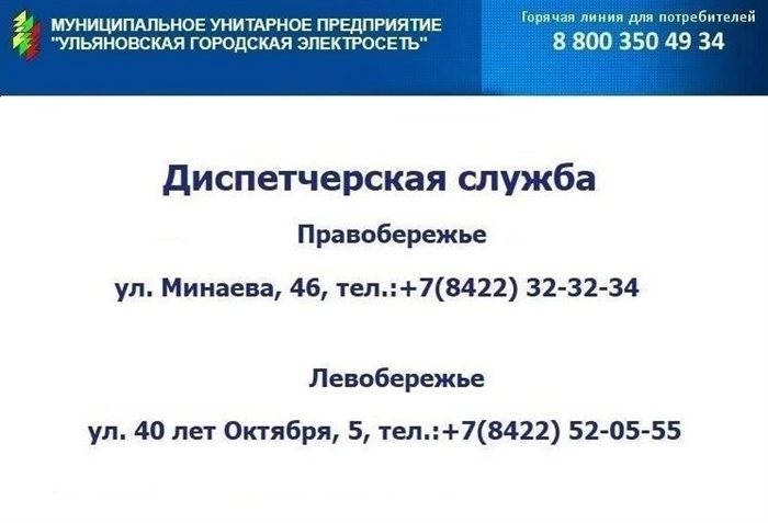 В случае возникновении аварийных ситуаций на электрических сетях вы можете обращаться в оперативно-диспетчерскую службу МУП «УльГЭС»: