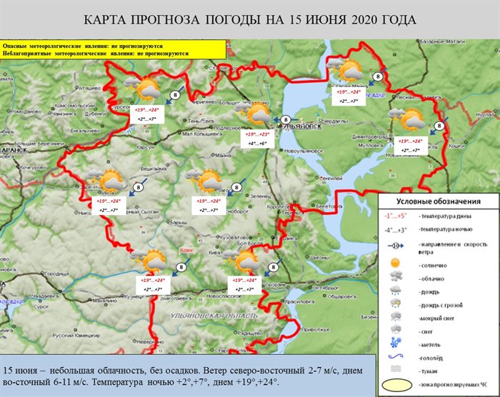 15 июня ожидается небольшая облачность. Ночной северо-восточный ветер сменится днем на восточный – 6-11 метров в секунду. Температура днем прогреется до +19°,+24°.