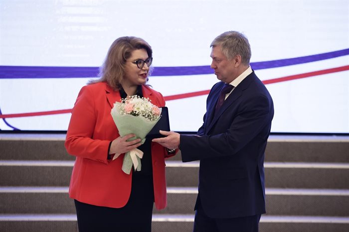 Губернатор Алексей Русских поздравляет Оксану Карпову со званием «Почетный работник в сфере юриспруденции Ульяновской области»