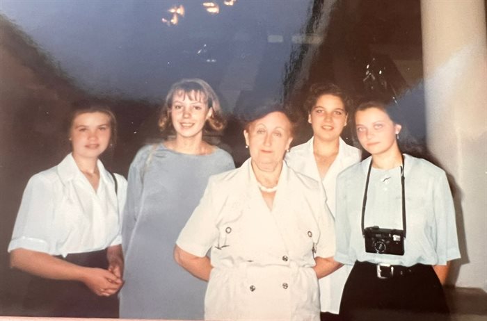 Оксана со своими школьными подругами и любимым учителем Татьяной Викторовной Филипповой
