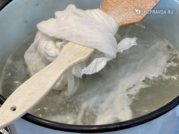 - Довести воду до кипения. Подготовленную мелкую рыбу сложить в марлю, подвязать на палочке и опустить в кипяток. Накрыть крышкой. Варить 1 час, затем достать рыбу и выбросить.