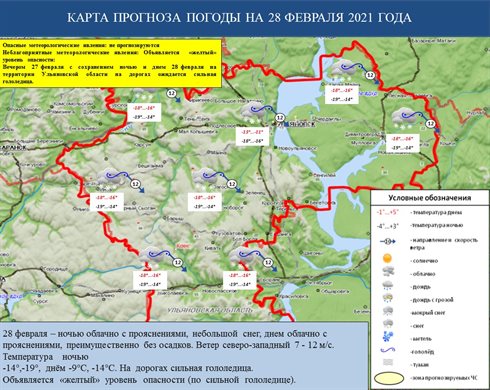 По данным специалистов Ульяновского центра по гидрометеорологии и мониторингу окружающей среды, днем 28 февраля на территории нашего региона прогнозируется облачная погода с прояснениями, преимущественно без осадков. Ветер будет дуть северо-западный со скоростью 7-12 метров в секунду. Температура воздуха днём -9°С, -14°С. На дорогах сильная гололедица.