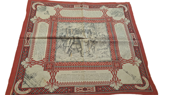 В фондах музея хранится еще один уникальный предмет, связанный с именем национального героя, - это платок, изготовленный на Даниловской мануфактуре в Москве, который так и называется «Подвиг Ивана Сусанина». Платок посвящен 300-летию правления Дома Романовых, которое отмечали в 1913 году. Ивану Сусанину довелось спасти жизнь основоположнику династии, чего Романовы никогда не забывали.