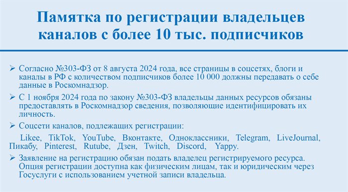 На портале Госуслуги работает механизм регистрации владельцев каналов и страниц в соцсетях, имеющих более 10 тысяч подписчиков.